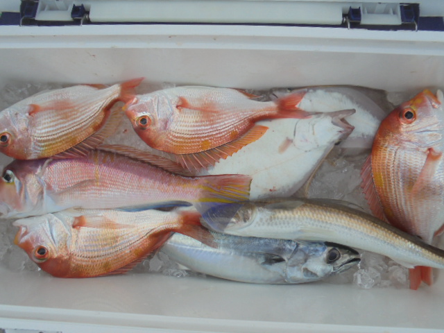 ソーダカツオ 1尾、レンコダイ 10尾、エソ 10尾、