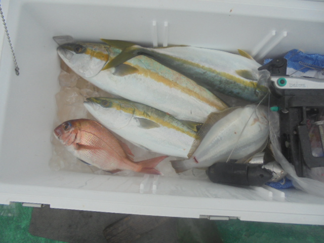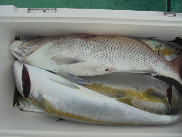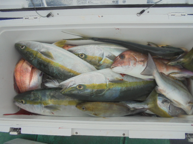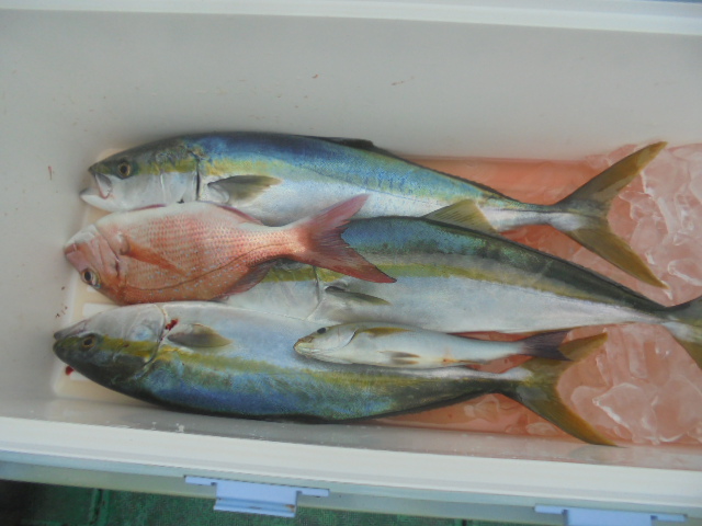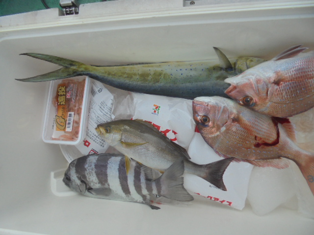 ヒラマサ 2尾、イナワラ 6尾、シイラ 2尾、イシダイ 1尾、マダイ 3尾、イサキ 1尾、