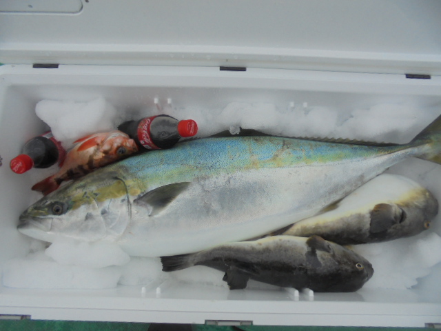 ブリ11㎏ 1尾、マダイ1.5㎏ 1尾、ショウサイフグ 3尾、沖メバル 1尾、レンコダイ 1尾、