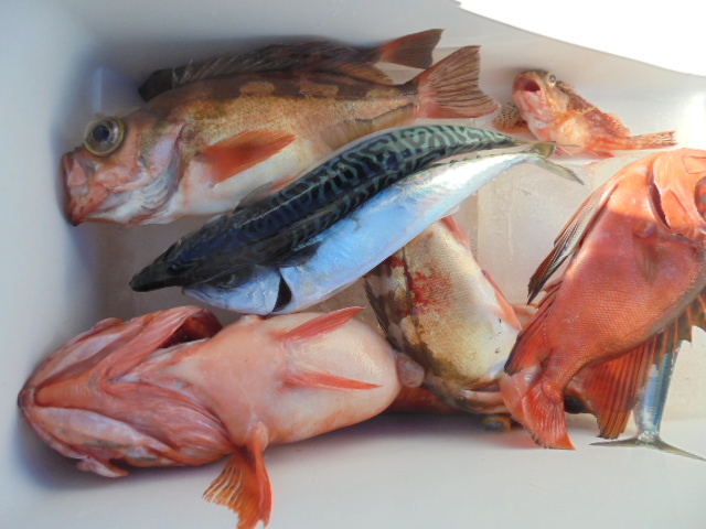 ウッカリカサゴ 4尾、レンコダイ 1尾、マダイ 2尾、サバ 6尾、