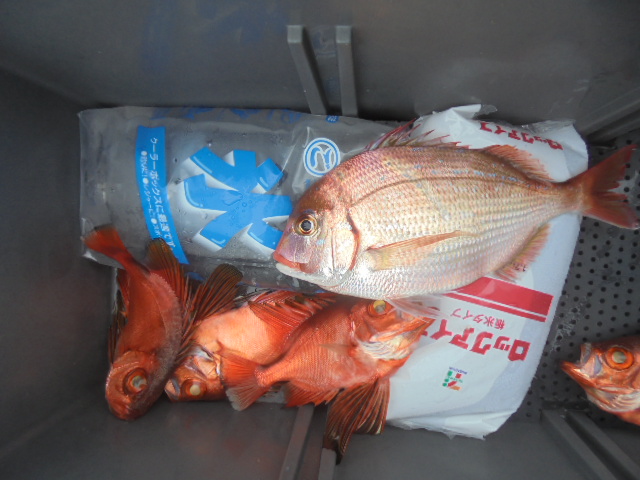 マダイ1㎏ 2尾、0.5㎏ 1尾、チカメキントキ5尾、沖メバル 3尾、