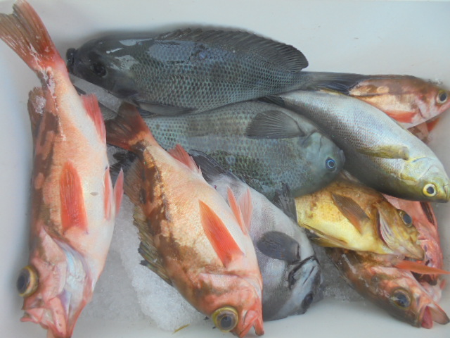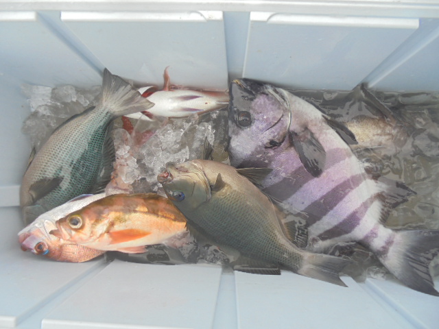 ムシカレイ 1尾、黄メバル 1尾、マダイ 1尾、イシダイ 3尾、