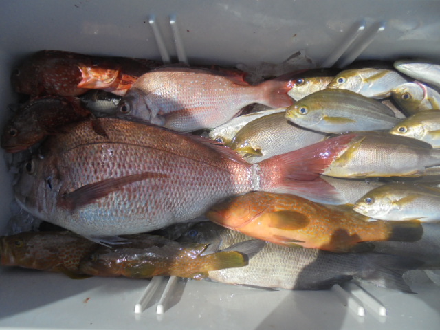 マダイ0.8・2.5・6.5㎏ 3尾、イサキ 29尾、メジナ 10尾、キジハタ 11尾、ウマヅラ 1尾、カサゴ 5尾、