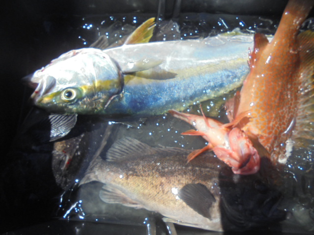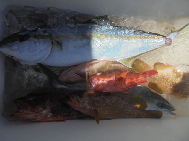 クロソイ2.5㎏良型 2尾、カサゴ 2尾、ワラサ 1尾、ヒラマサ 1尾、