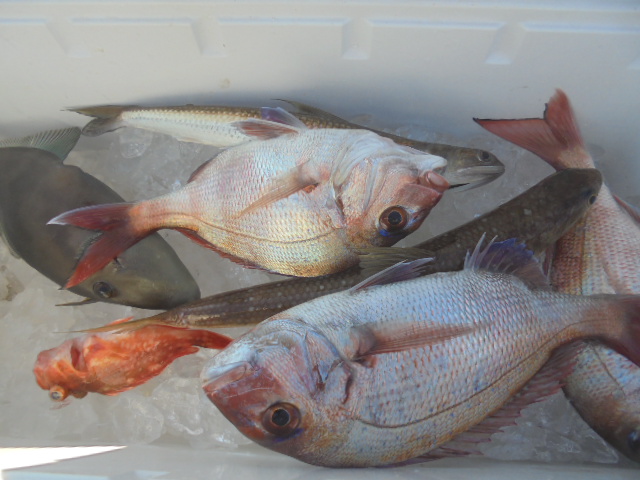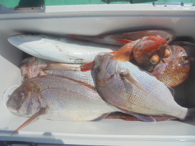 マダイ0.3~1.0㎏ 10尾、チカメキントキ 3尾、ウマヅラ 1尾、