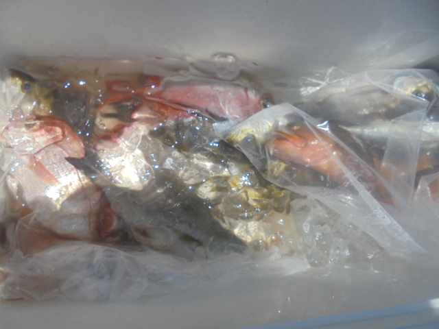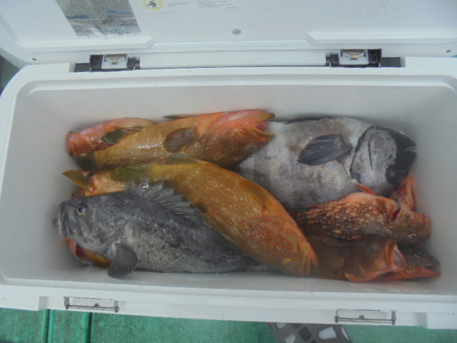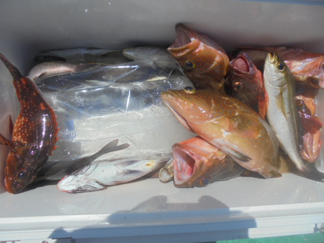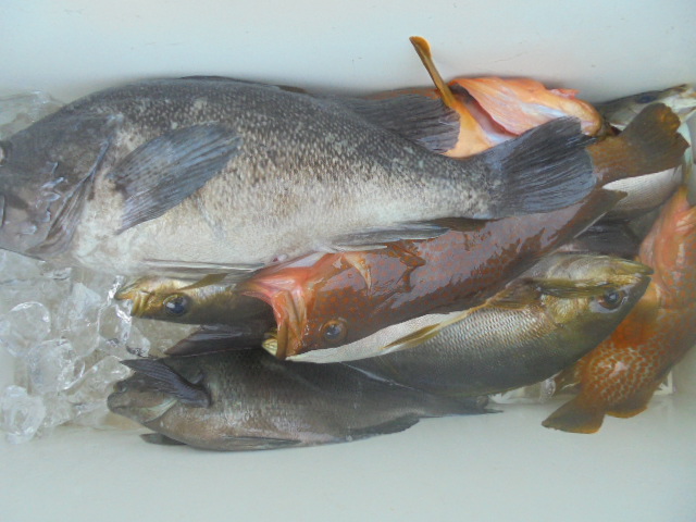 イサキ 12尾、メジナ 2尾、タイ小 2尾、キジハタ 6尾、カサゴ 7尾